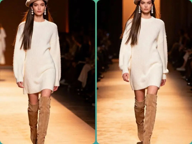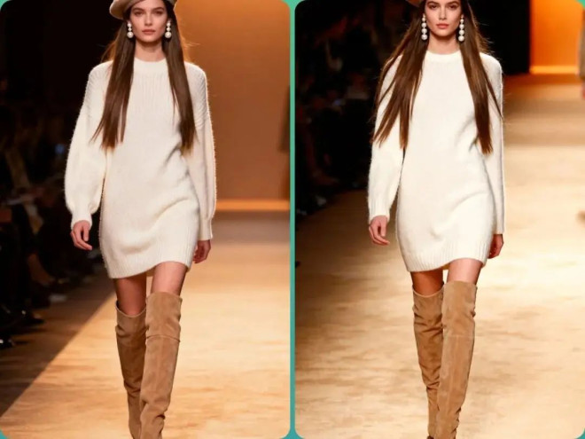 搭配:米白色针织连衣裙 + 驼色过膝靴 + 贝雷帽 + 珍珠耳环