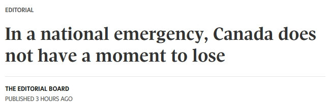 加媒《环球邮报》今天发表社论,题为“国家危机当前,加拿大一刻也不能再拖”。