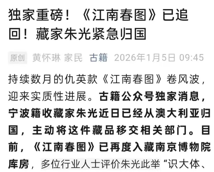 1月5日,据称在“业内颇有知名度”的微信公众号“古籍”发文《独家重磅!〈江南春图〉已追回!藏家朱光紧急归国》。文章称,“宁波藉收藏家朱光近日从澳大利亚归国,主动将这件藏品移交给相关部门。目前,《江南春图》已再度入藏南京博物院库房”。