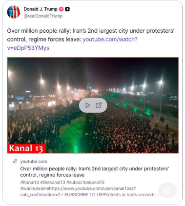 川普1月9日凌晨分享了一段油管视频,表示伊朗第二大城市马什哈德有超过一百万名伊朗民众走上街头抗议。