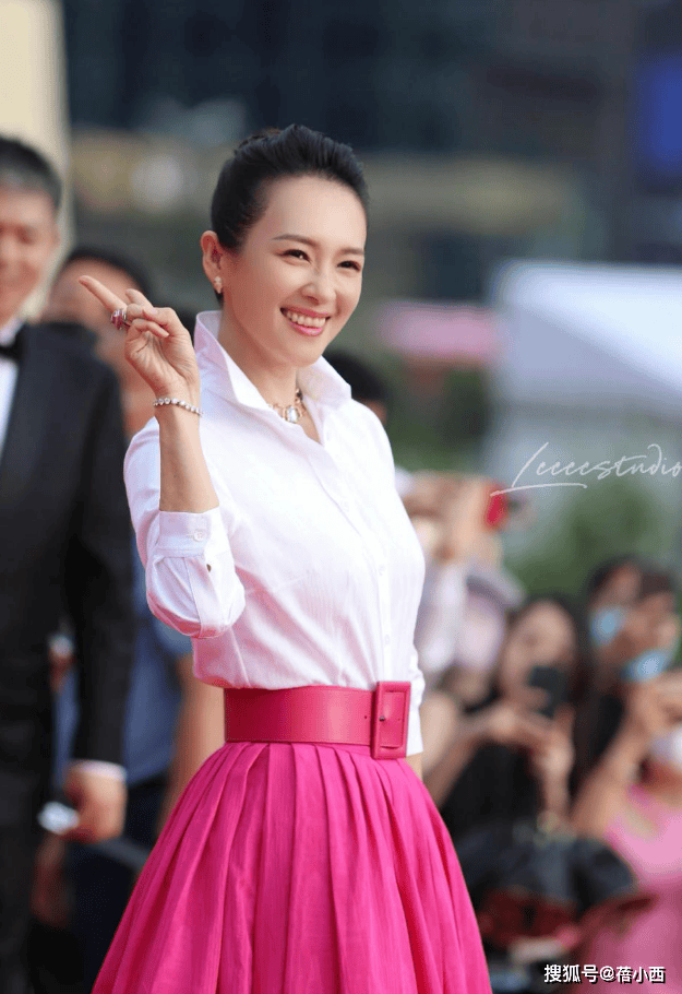 白襯衫領子沒有翻下來,這樣的處理讓脖子看上去更長了。下身是玫紅色半身裙,顏色很是鮮艷。