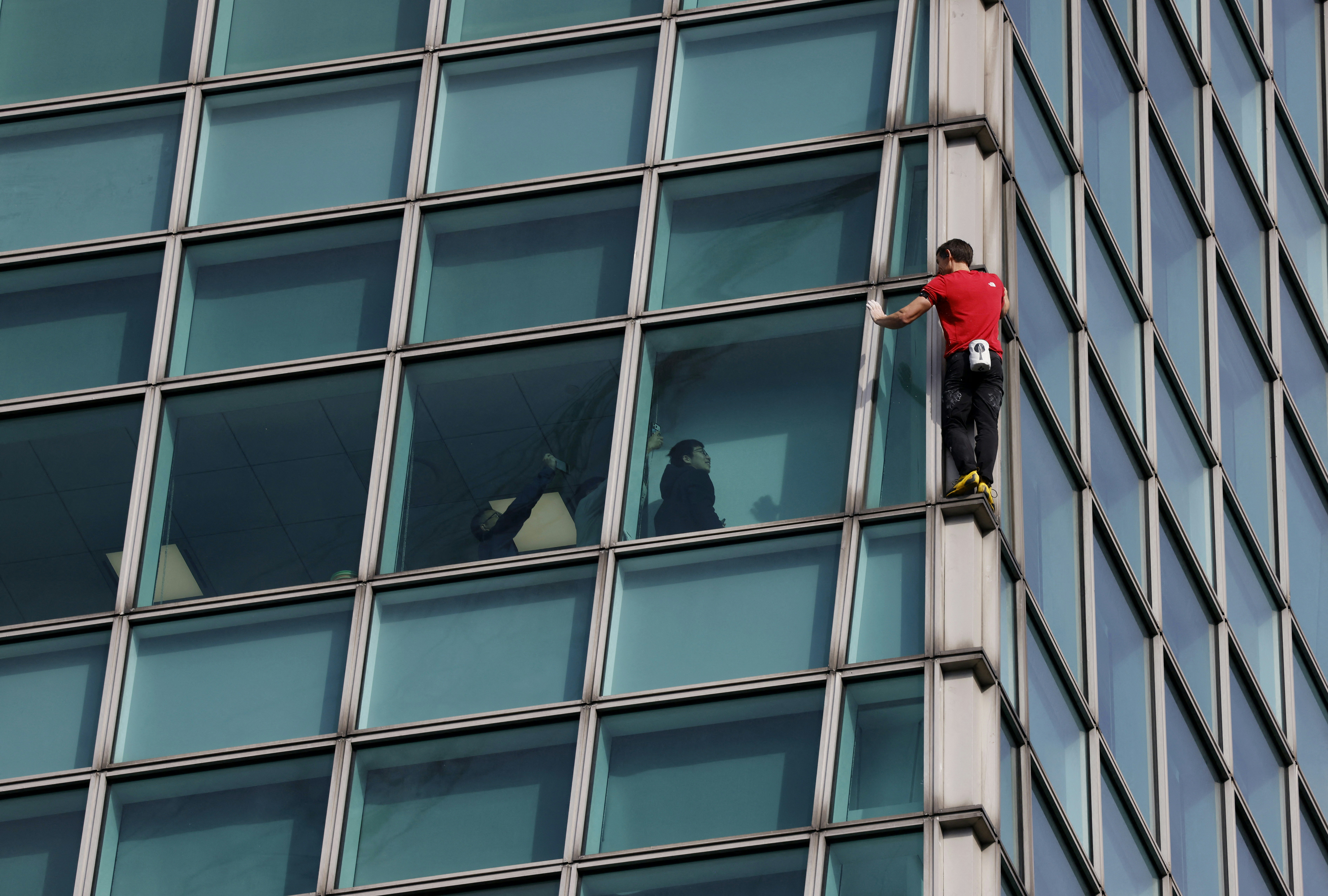 霍諾德25日上午攀爬台北101。(路透社)