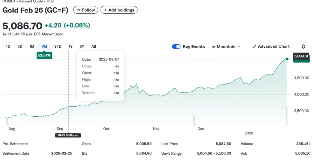 周一晚间,黄金价格收于每盎司5004美元,盘中曾短暂触及5100美元,而去年10月仅为4000美元