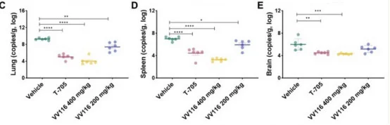 還有一個現象是,400mg/kg濃度的VV116給藥的倉鼠,肺和脾中的病毒拷貝數都較少,大大優於T-705(注意縱坐標是對數坐標),與濃度減半的VV116相比,更是遙遙領先。而腦中的病毒拷貝數,卻有明顯的“拉平”效應,與對照組(溶劑/載體對照組vehicle)相比,差距也明顯縮小,因此對腦炎的治療效果,其實還有探討的空間。