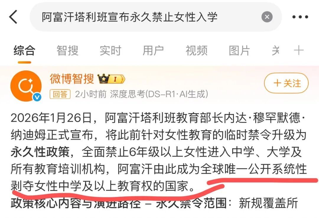 阿富汗永久禁止女性接受教育的信息在網絡傳開,在微博智搜上對阿富汗塔利班的描述是:“阿富汗由此成為全球唯一公開系統性剝奪女性中學及以上教育權的國家。”
