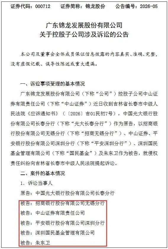 日前,中山证券第一大股东锦龙股份披露,中山证券卷入一桩涉案金额近4.9亿元的侵权责任纠纷,原告光大银行长春分行将招商银行无锡分行、平安银行深圳分行等五家机构告上法庭。
