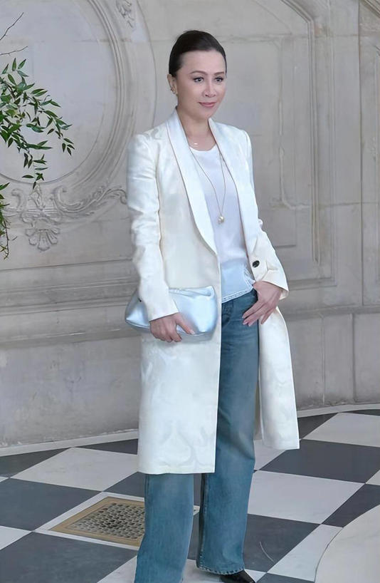 60歲的劉嘉玲一出場更是氣場炸裂。別人為了上鏡硬扛低溫穿露肩裝,她直接裹上珠光白刺繡風衣,內搭半透白上衣,下身配條藍色牛仔褲,混搭得大膽又高級。