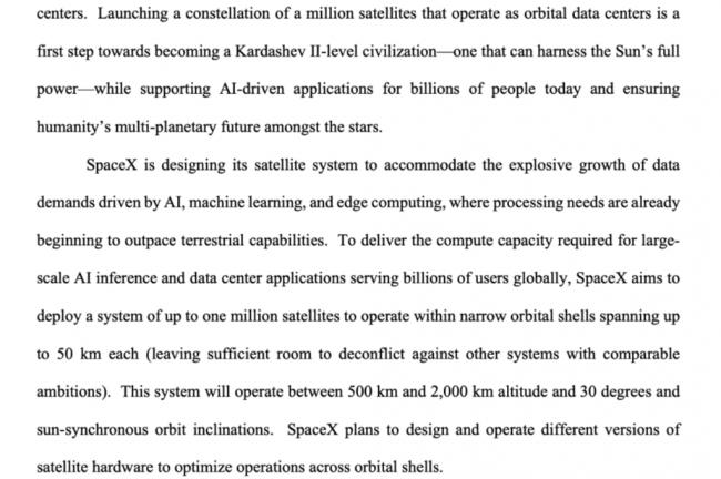 “為滿足服務全球數十億用戶的大規模AI推理和數據中心應用所需的算力,SpaceX計劃部署一個最多由100萬顆衛星組成的系統。