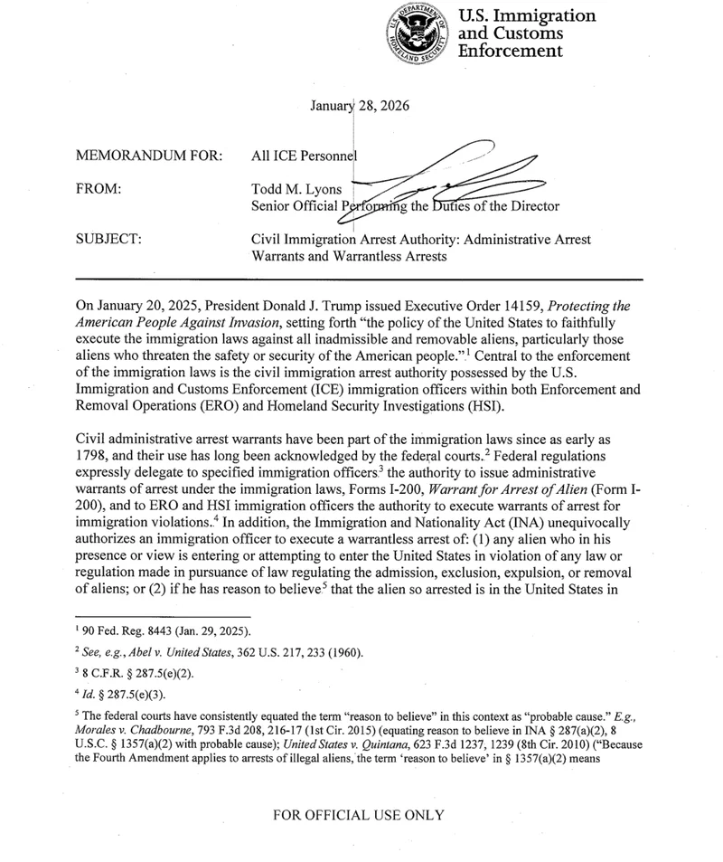 该备忘录由ICE代理局长莱昂斯(Todd M. Lyons)于1月28日周三签署,发给全体ICE人员,核心内容围绕一项联邦法律展开。