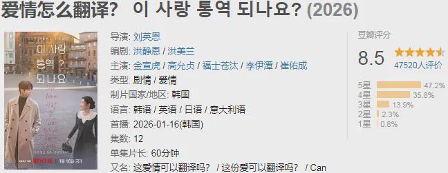 该剧豆瓣开分7.8分,一路上涨至8.5分,成为近年来少有的口碑上乘的纯正melo(韩国“传统爱情剧”的称谓)。