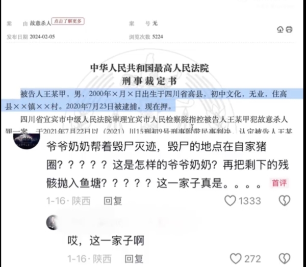 此案引发了网友热议,“家庭教育失败的恶果,在这一家人身上体现得淋漓尽致。知道孙子杀了人,第一反应不是送他去自首,而是帮忙焚尸抛尸。这不是爱,是纵容!”“所有大恶都是从小恶开始。原生家庭有很大关系”“杀了两人都还帮他隐瞒并毁尸灭迹,由此可见王某甲从小被这一家人有多溺爱。要没有爷爷奶奶的故意隐瞒,也就不会有第3名受害者。王某甲罪大恶极,其家人负有不可推卸的责任,特别是他的爷爷奶奶,必须要追究其窝藏包疪的罪行”。