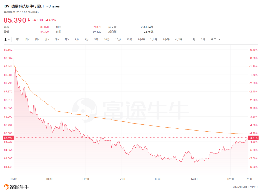 追蹤科技軟件板塊的$擴展科技軟件行業ETF-iShares (IGV.US)$刷新日低時日內跌5.6%,截至周二已連跌六個交易日,六日累跌超14%。該ETF今年1月已累跌約15%,創2008年以來最差單月表現。