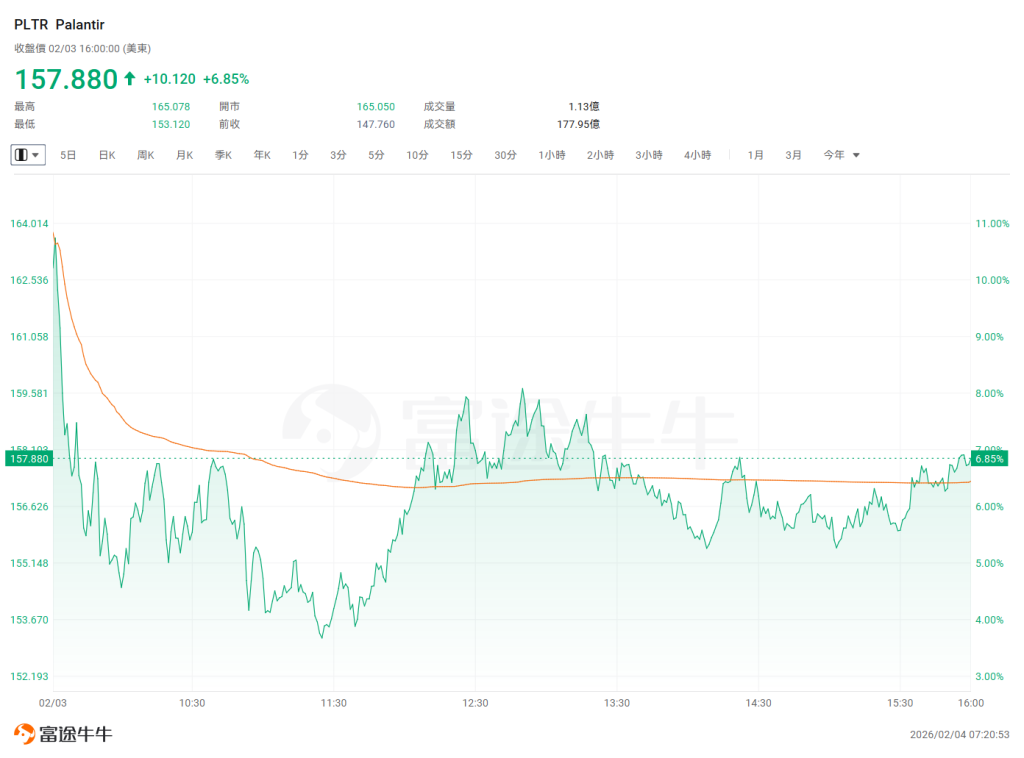 AI概念股中,大數據分析公司 $Palantir (PLTR.US)$ 逆市大漲。該公司本周一盤後公布,第四季度營收增長70%,超出華爾街預期,同時給出了大超預期的今年年度營收指引。其股價周二收漲近7%。