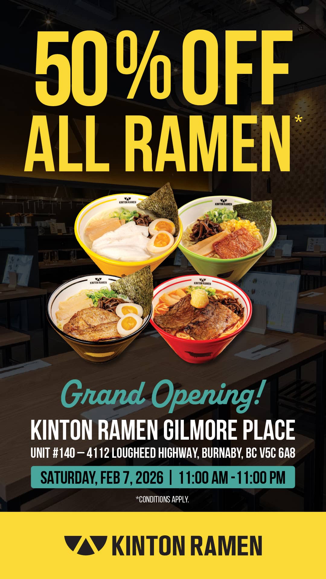 總部位於多倫多的正宗日本拉面館 Kinton Ramen 正在緩慢但穩步地占領大溫地區,這家拉面界的巨頭目前在溫哥華市中心的羅布森大街(Robson Street)、北溫UBC素裡都有分店,並在本拿比 Brentwood 的 Gilmore Place 開設了首家分店,將於2月7日星期六舉辦盛大開業典禮。為慶祝開業,該餐廳將為堂食顧客提供所有拉面的半價優惠!