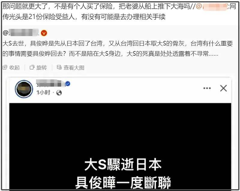 还记得大S死讯曝光之后不久,台媒就曝出具俊晔一度失联,还有消息称他去处理了二十多份保险