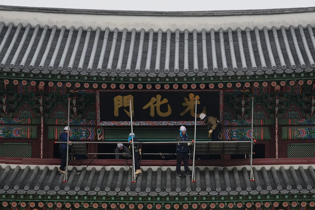 2025年12月16日,韩国首尔,工人们在景福宫正门光化门搭建脚手架并检查招牌。(视觉中国