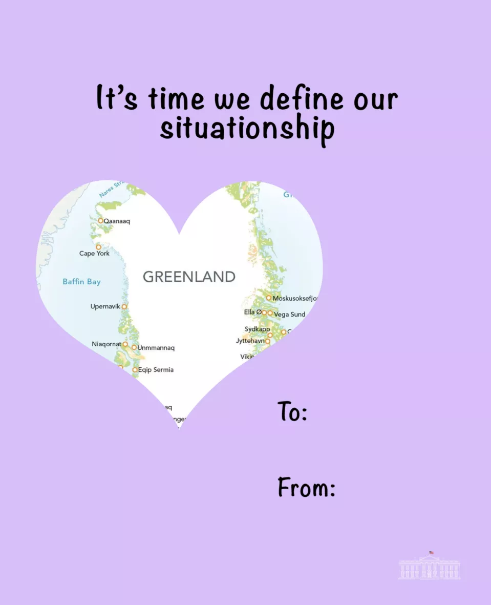 卡片把整個格陵蘭島用愛心框住,寫著:“是時候定義我們的曖昧關系了。”