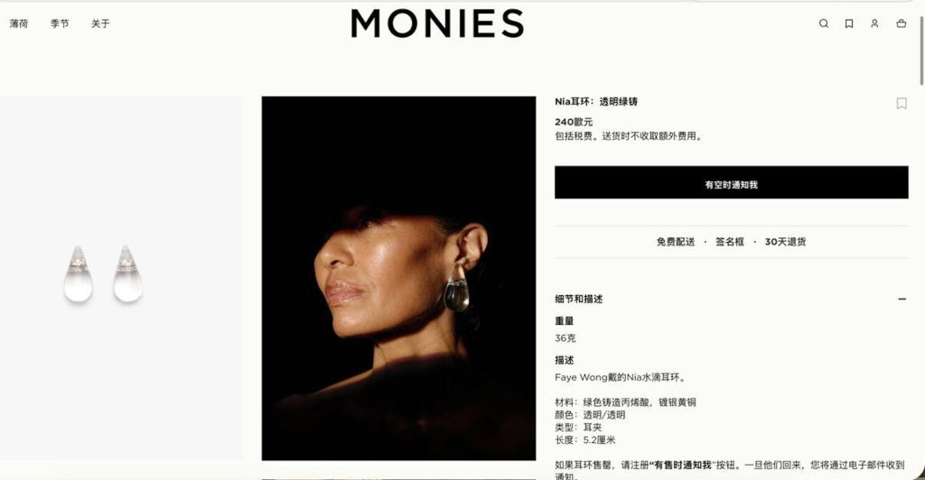 MONIES品牌官网已悄悄更新产品页面。(网页截图)