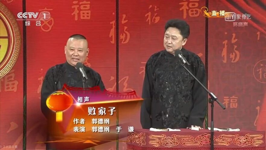 此前一年,2013年,他的師父郭德綱第一次,也是至今唯一一次登上春晚舞台,和於謙合作相聲《敗家子》。作品以環保為話題,諷刺鋪張浪費,也讓全國觀眾記住了於謙的三大愛好,“抽煙、喝酒、燙頭”。