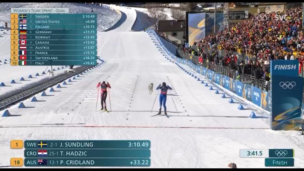 (加西網綜合)近日,在米蘭科爾蒂納冬季奧運會越野滑雪女子團體資格賽上,一只兩歲的捷克斯洛伐克狼犬突然闖入賽道、一路沖向終點線,引發全場驚呼與笑聲,並走紅網絡。