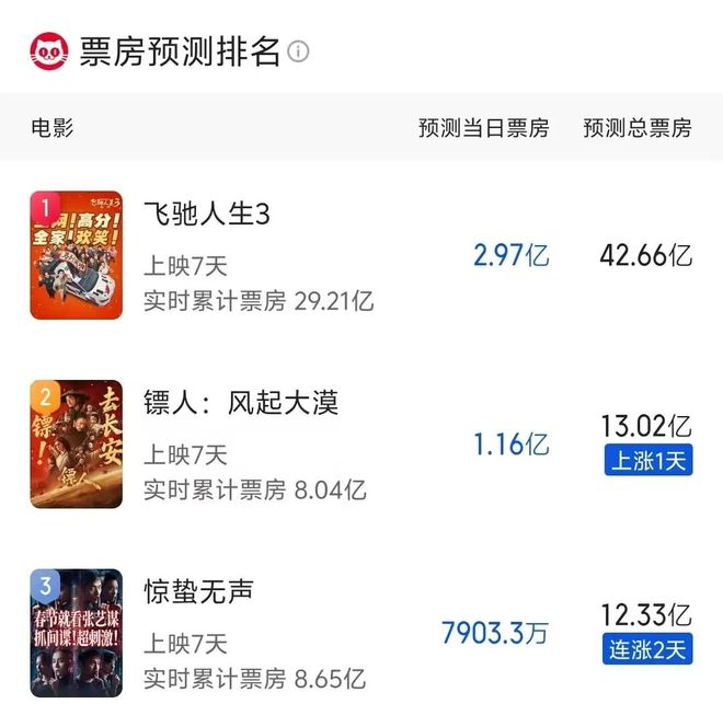 《镖人:风起大漠》虽然连续三日实现逆跌,豆瓣评分更高达7.5,但首日排片劣势突出,全靠口碑推动,导致后续排片难以与头部影片抢夺市场空间。而《惊蛰无声》因内容争议导致排片占比不稳定,但票房排名还是稳在第二的位置,可见普通观众是认可的。