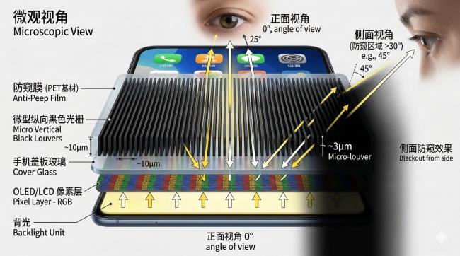 借助光栅原理,让屏幕发出的光只能从正面特定角度范围内看到,从而实现“大角度防窥”的效果: