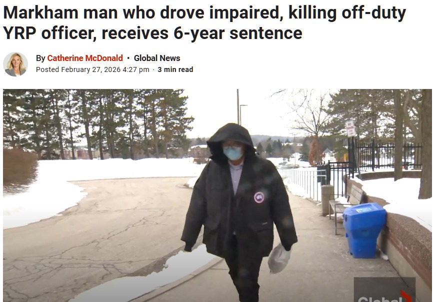 (加西网综合)一名来自安省万锦市的男子仅持有 G2 驾照,却酒后驾车,导致迎面相撞事故,造成休班的约克区警察(YRP) 警官特拉维斯·吉莱斯皮 (Travis Gillespie) 死亡,该男子被判处六年监禁。