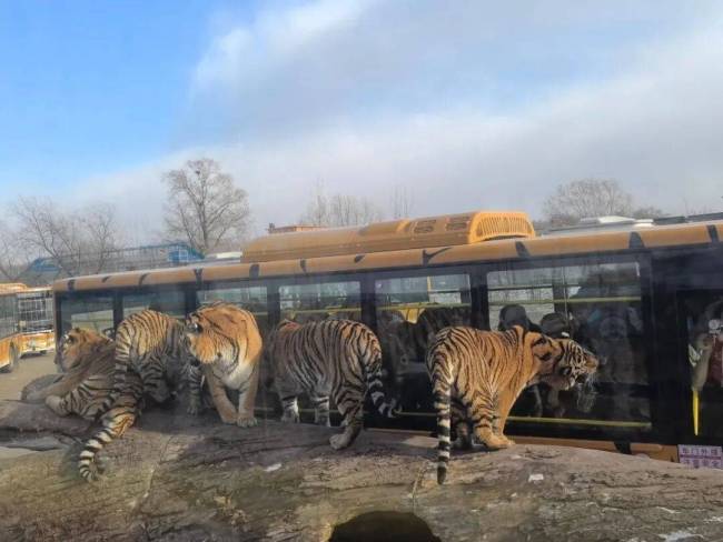 在哈尔滨东北虎林园,想投喂老虎的游客可以乘坐“惊险车”。园区里13处散放投喂区,车停在老虎周围后,通过车上的孔洞把肉条递给老虎。