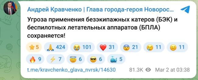 从周一凌晨3:38开始,克拉夫琴科在电报频道上陆续报告称有来自空中和海军无人机的威胁。大约30分钟后,他发布通报称“伊萨耶娃街至苏沃洛夫街的路堤区域”已封闭交通。