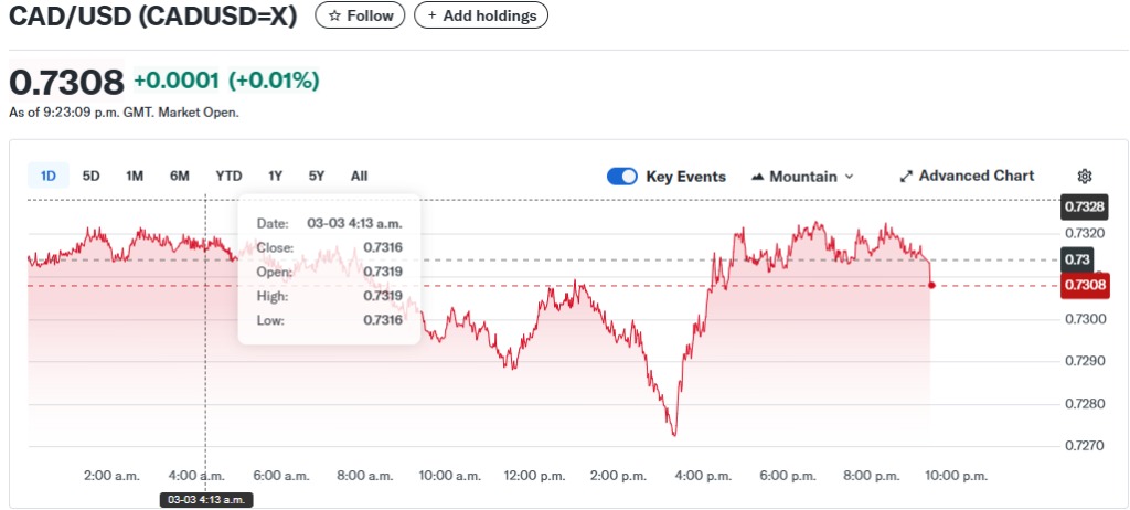 Schamotta提到,尽管近期能源投资下降,加拿大元未能完全受益于其商品货币身份,但随着油价突破每桶75美元,这种关联性通常会增强。自上周五以来,受美国和以色列对伊朗发动攻击影响,美国西得克萨斯中质原油(WTI)价格从每桶67.02美元上涨至77.35美元,涨幅超过15%。