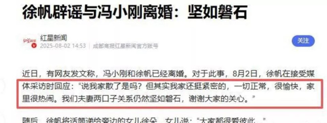 距離上次徐帆帶著女兒出面辟謠婚變,才過去7個月。 那時候徐帆攥著徐朵的手,對著鏡頭笑著說“我們家堅如磐石” 。 可後來馮小剛清空社交平台裡和徐帆的所有合照,又獨自帶著徐朵走芭莎紅毯、見陳思誠密談,身邊始終不見妻子的身影 。 網友們的猜測就沒停過:這兩口子,到底還行不行?