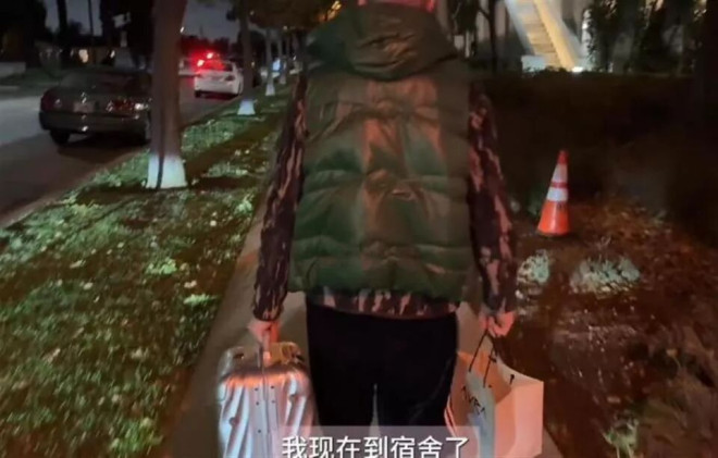 一手提著行李箱,一手拎著購物袋,站在宿舍門口久久不願離去。