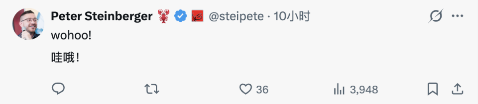 有意思的是,同樣剛加入 OpenAI 的龍蝦之父 Peter Steinberger,也跑到評論區湊熱度,主打一個新同事貼貼。