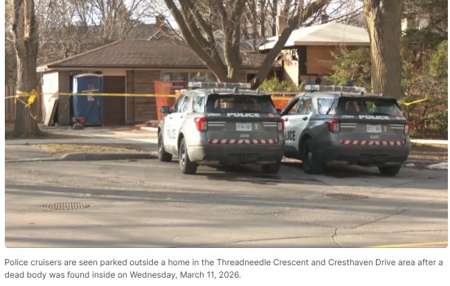 2026年3月11日星期三,在Threadneedle Crescent和Cresthaven Drive附近的一處住宅內發現一具屍體後,警車停在住宅外。