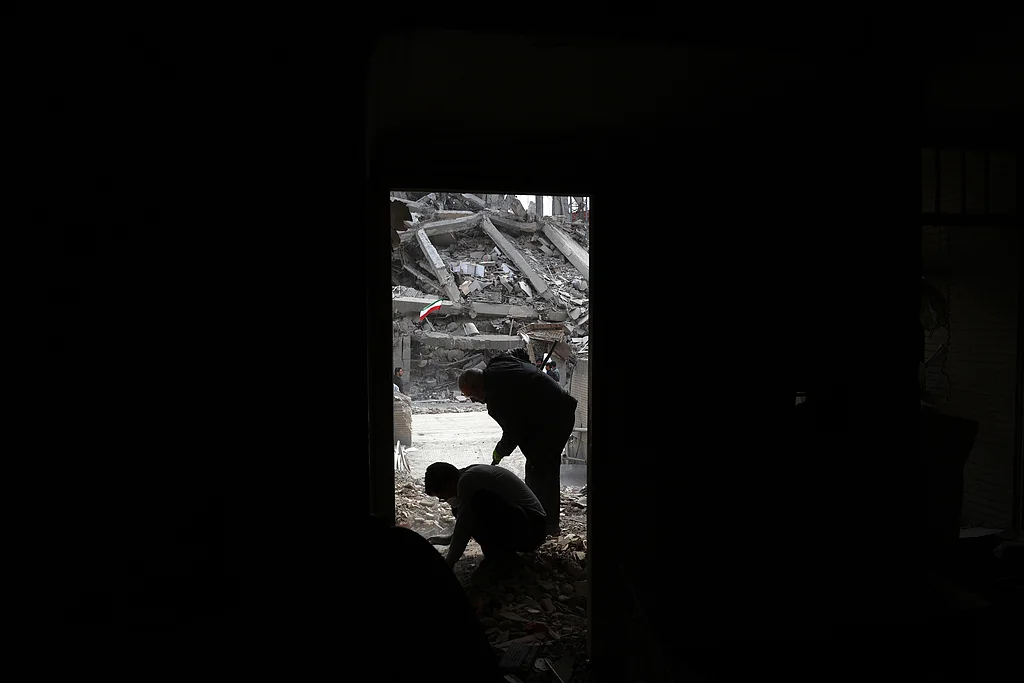 当地时间2026年3月12日,伊朗德黑兰,民众在市中心受损居民楼的废墟中整理物品。视觉中国