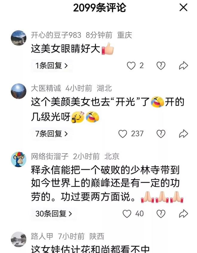 網友們的評論也是五花八門。有的調侃說“這美女眼睛可真大,是不是也去‘開光’了?”也有人替他說話,說他畢竟把少林寺這塊牌子推向了全世界,功勞不小。
