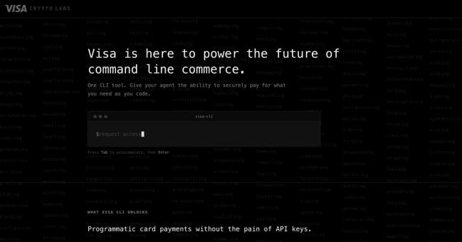 3 月 18 日,Tempo 主网上线同一天,支付巨头 Visa 也动了。新成立的 Crypto Labs 部门发布了第一个产品:Visa CLI,一个让 AI Agent 直接从终端发起信用卡支付的工具。