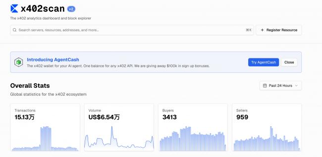 Coinbase 的 x402 协议是目前落地最早、生态最广的 AI 支付协议。根据 x402scan 的数据,过去 24 小时,整个生态的交易额是 6.54 万美元。15 万笔交易,平均每笔不到 5 毛钱。