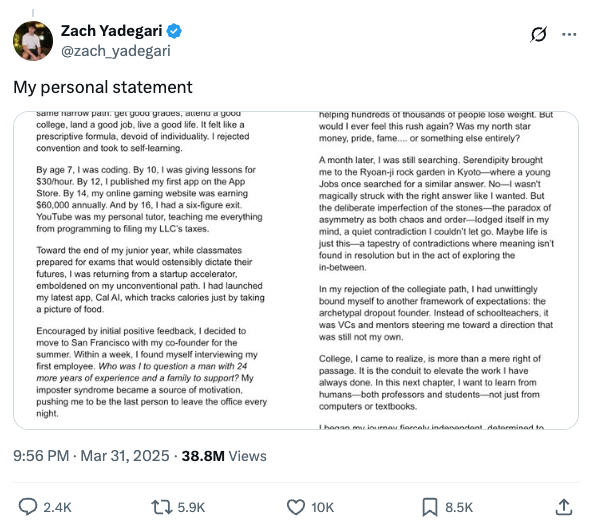 還有一點是他極其擅長營銷。Cal AI早期靠社交媒體營銷爆紅,他發的這條推文“我GPA4.0,自研APP賺3000萬美元但是申請藤校被狂拒”的帖子也是在短時間內爆紅,這都為他在商業上的成功添磚加瓦。