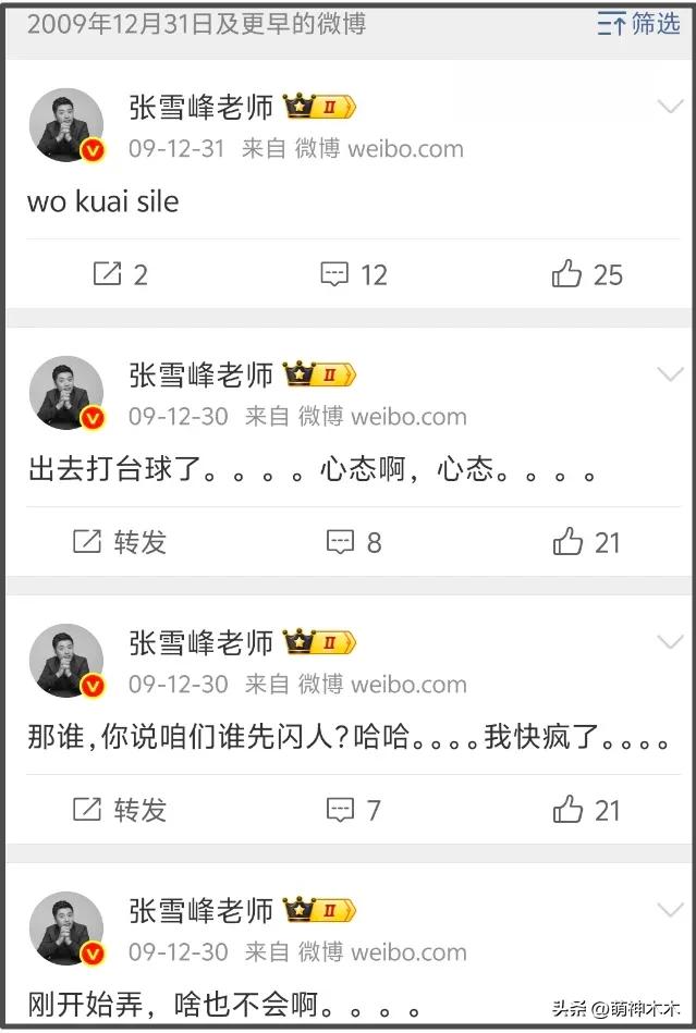 张雪峰从2009年起,也就是17年前,就开始使用微博了,使用微博第二天,张雪峰就发了一条“wo kuai sile”。