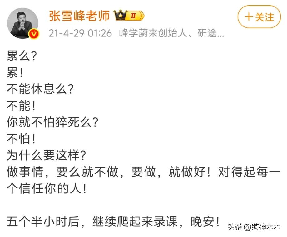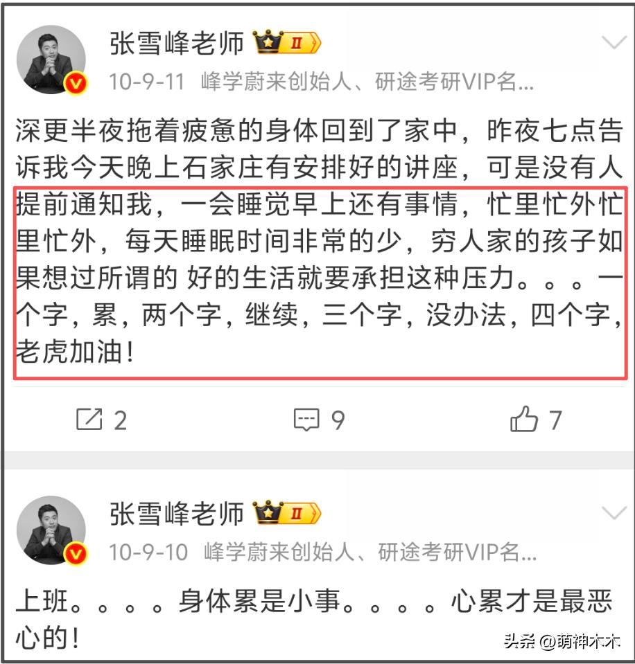 十几年时间,张雪峰发了几十条喊累的微博,早年没日没夜到处跑线下讲座,累到不想生活,累到想哭,走红之后,工作量更大了,连过生日都觉得累。