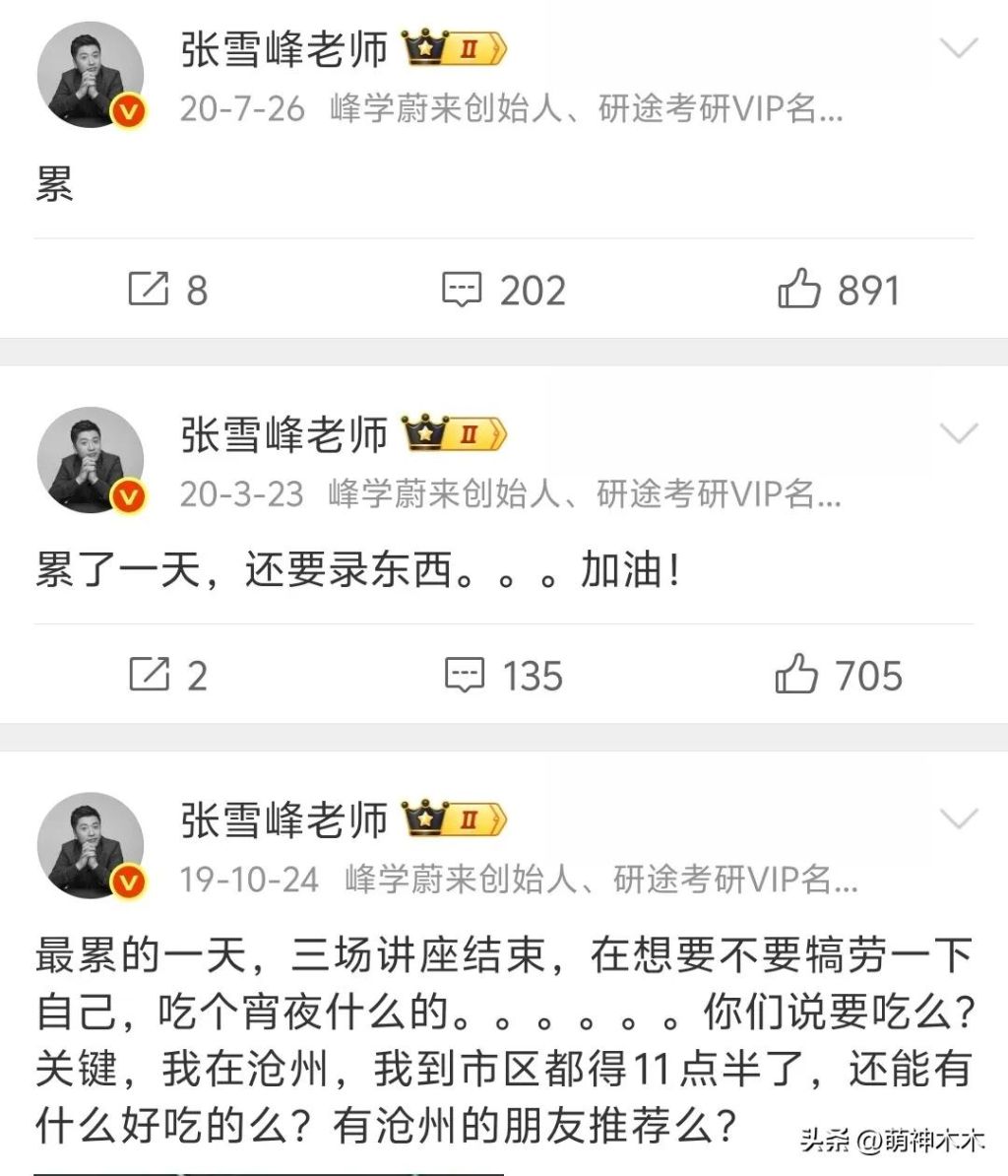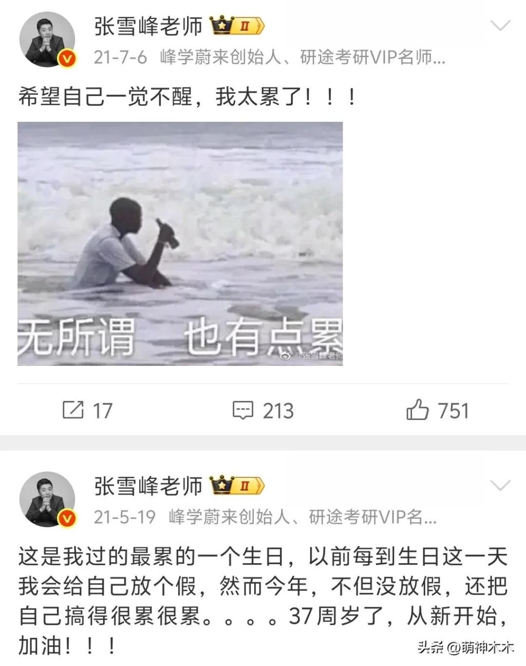十几年时间,张雪峰发了几十条喊累的微博,早年没日没夜到处跑线下讲座,累到不想生活,累到想哭,走红之后,工作量更大了,连过生日都觉得累。