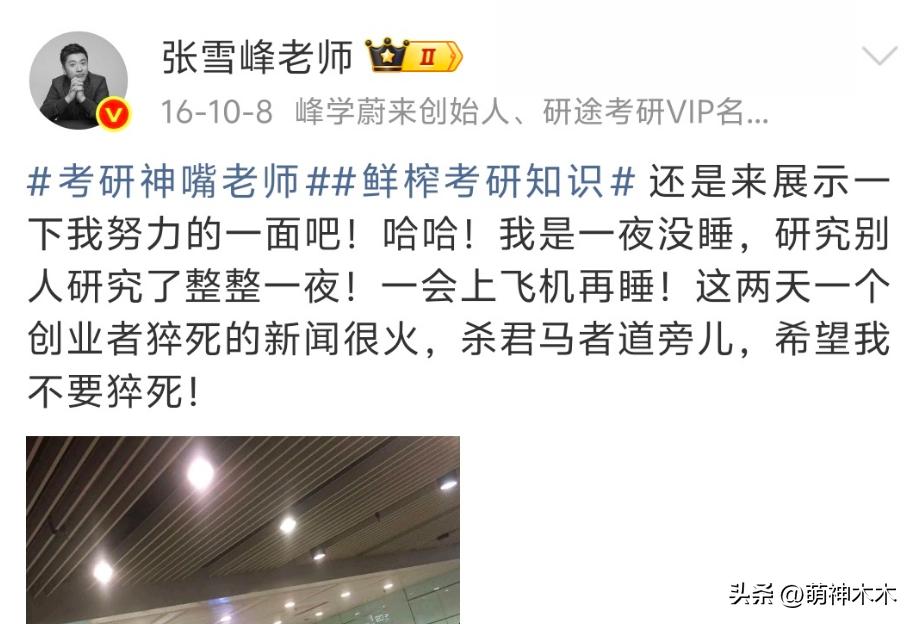 2016年,张雪峰微博第一次出现了“猝死”两个字,他一夜没睡,坐在机场担忧着、感慨着,希望自己不要猝死。