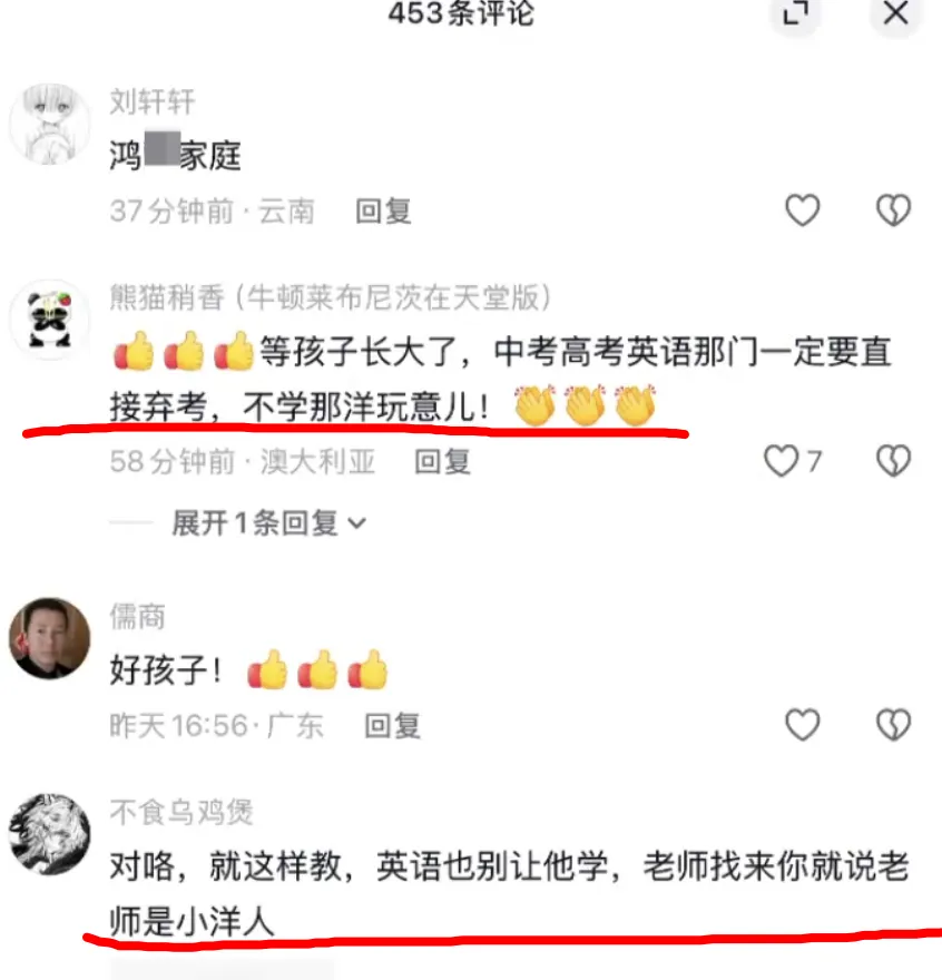 评论区也很有意思,给我的感觉是大家似乎都在笑,也都看得比较清楚,可大家就是不愿意跟她多说。有些甚至干脆助力一把,夸她教的好,要继续保持下去。