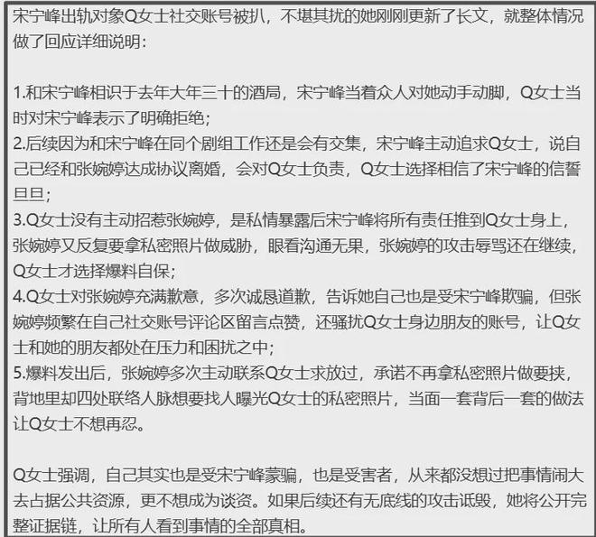 總結一下Q女士回應重點,她強調宋寧峰在大年三十酒局先動手動腳,自己明確拒絕了,二人在同一個劇組工作,被拒絕的宋寧峰不肯放棄,透露和張婉婷簽了離婚協議,會對她負責,Q女士才選擇相信。