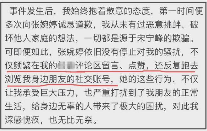只不過比起宋寧峰,Q女士明顯對宋寧峰妻子張婉婷更有情緒,強調自己和張婉婷多次道歉,但張婉婷還是不肯放過她,一邊用曝光私密照片威脅,一邊去Q女士社媒點贊留言,還會瀏覽Q女士朋友賬號。