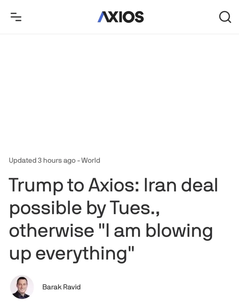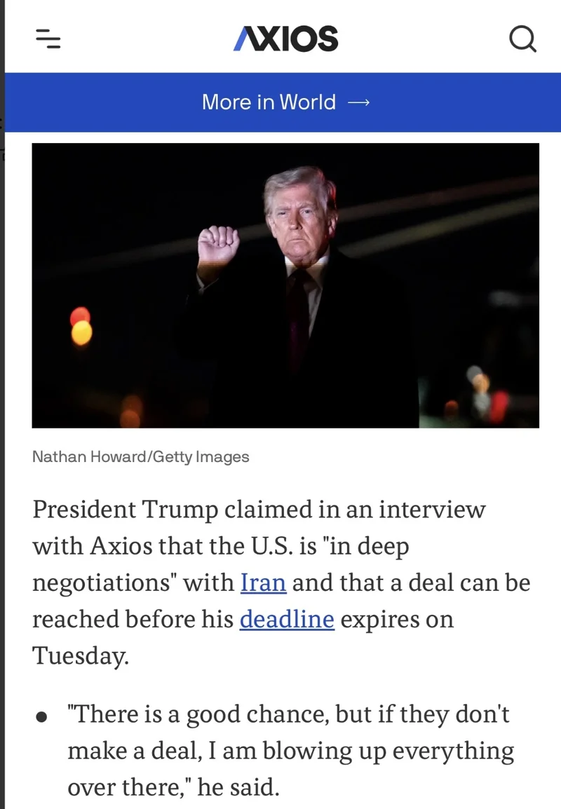 报道说,过去十天里,美国伊朗通过巴基斯坦、埃及和土耳其进行了间接谈判,试图达成停火协议,以换取霍尔木兹海峡的开放。但尚未取得任何重大进展。周日早上,在接受Axios电话采访前不久,特朗普威胁称,如果伊朗政权不开放霍尔木兹海峡,将从周二开始轰炸伊朗的发电厂和桥梁。