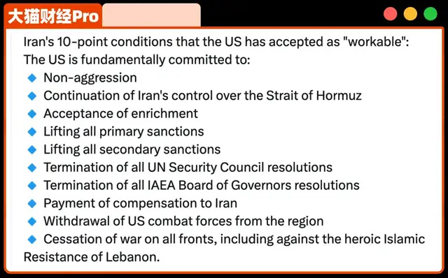 美伊互不侵犯、伊朗實控海峽、結束包括黎巴嫩真主黨在內的戰爭、美國從海灣撤軍、賠償伊朗、接受鈾濃縮、解除一級和次級制裁、撤銷原子能機構協議、撤銷安理會決議。