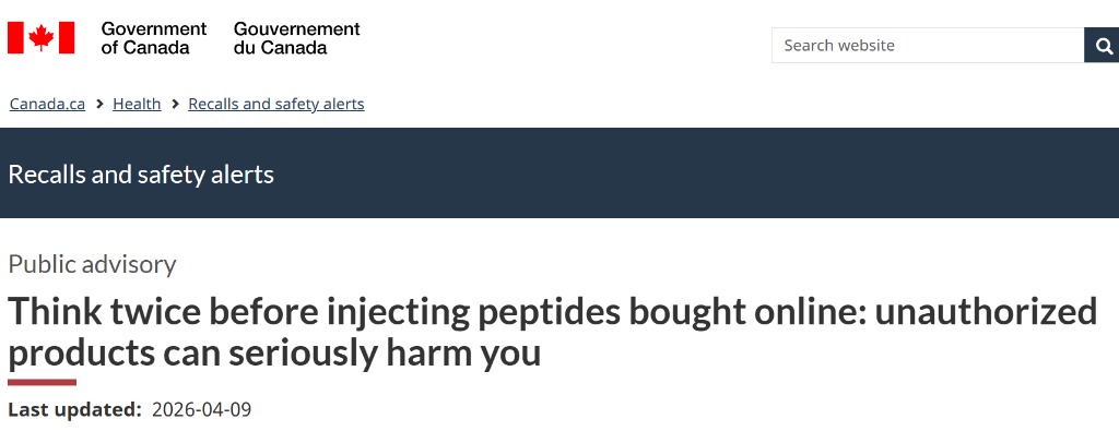加拿大卫生部(Health Canada)在周四发布的公告中表示:“在注射从网上购买的肽类产品前请三思”,并强调未经授权的药物可能对健康造成严重伤害。