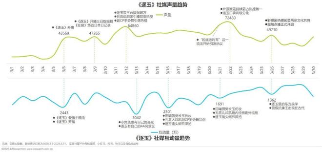 《逐玉》社媒声量与互动量走势高度同步,开播即实现强势破圈,全周期热度由剧情内容持续驱动,用户参与度稳步提升。